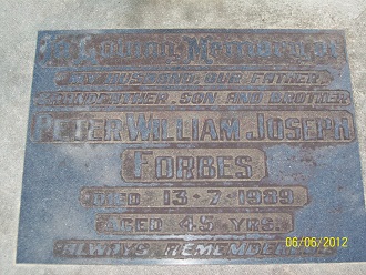 In loving memory of my husband, our father, grandfather, son and brother PETER WILLIAM JOSEPH FORBES Died 13.7.1989 Aged 45 years. Always remembered. Parents : William Ross and Beryl Mildred nee Clark Death Cert No. 1989/58630 |