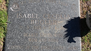 May Jesus I love thee BUGLER ISABEL CECELIA 28.9.1919-12.120.00 Dearly loved wife Mum & Nana. Resting in the everlasting arms (Salvation Army Insignia) |