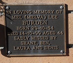In loving memory of MEL (MELVA) LEE BURDEN Born 29.10.54 Died 14.10.99 Aged 44 Sadly missed by Shane, Ben, Laura and Denis.