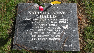 NATASHA ANNE CHALLIS Our previous little Angel. 11.9.1983-6.4.1994. A happy smile, a heart of gold, you were the best this world could hold, so dearly loved, so sadly missed. |