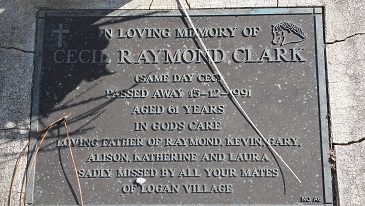 In loving memory of CECIL RAYMOND CLARK (Same day Cec) Passed away 15.12.1991 Aged 61 years. In God’s Care. Loving father of Raymond, Kevin, Gary, Alison, Katherine, Laura; Sadly missed by all your mates of Logan Village Parents : Benjamin John Clark and Vera Emma nee Franklin Death Cert No. 1991/354. |
