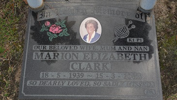 In loving memory of our beloved Wife Mum & Nan MARION ELIZABETH CLARK 18.5.1939 – 15.3.2000 so dearly loved Sadly missed. Plus a seat nearby. |