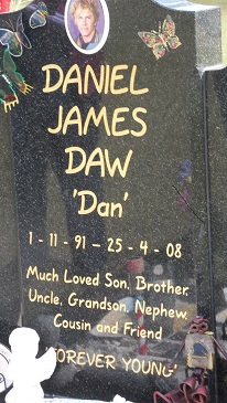 DANIEL JAMES DAW 'Dan' 1.11.91-25.4.08 Much loved son, brother, uncle , grandson, nephew, cousin and friend 'FOREVER YOUNG' |