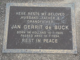 Here rests my beloved husband, father & grandfather JAN GERRIE de BUCK Born in Holland 18.7.1906 Passed away 18.7.1994 Rest in peace. Death Cert No. 1994/6583 Parents : Cornelis de Buck and Trijnthje nee Klein |