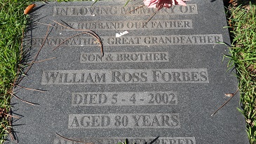 In loving memory of my Husband Our father Grandfather Great Grand father Son & Brother WILLIAM ROSS FORBES Died 5.4.2002 aged 80 years. Always Remembered. |