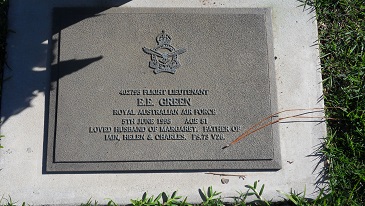 402795 Flight Lieutenant E.E. GREEN Royal Australian Air Force 5th June 1998 Aged 81. Loved Husband of Margaret, father of Iain, Helen, and Charles; Ps 73 V 26. |