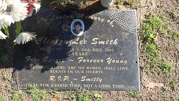 CLINTON LEE SMITH (SMITY) Forever Young Born 10th June 1989 Passed 23rd Dec 2003. In loving memory of (photo) CLINTON LEE SMITH 10th June 1989 – 24th Dec 2003 14 years Free Spirit – Forever young Sometimes there are no words, only love always in our hearts R.I.P. – Smitty Here for a good time, not a long time. |