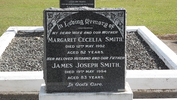 In loving memory of my dear wife and our mother MARGARET CECILIA SMITH died 12th May 1992 aged 82 years. Her beloved husband and our father JAMES JOSEPH SMITH. Died 19th May 1994. Aged 83 years In God’s Care. Death Cert No. 1992/4035 Parents : Edmund Michael Hannon and Mary Ellen Josephine nee Mahoney. |