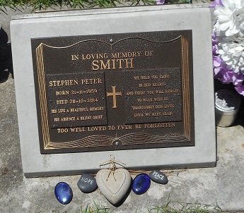 In Loving memory of SMITH STEPHEN PETER Born 21.11.1959 Died 28.10.2014 His life a beautiful memory, His absence a silent grief. We hold you close in our hearts and there you will remain to walk with us. Throughout our days until we meet again. Too well loved to ever be forgotten. |
