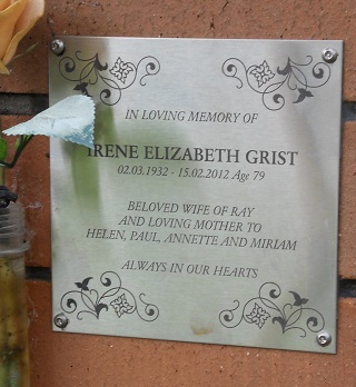 In loving Memory IRENE ELIZABETH GRIST 02-03-1932 15-02-2012 Beloved wife of Ray and loving mother to Helen, Paul, Annette and Miriam Always in our hearts. |