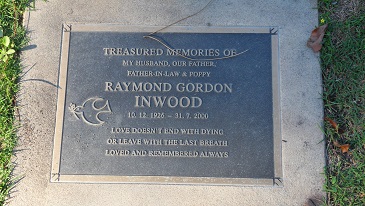 Treasured memories of my husband our father father in law & poppy RAYMOND GORDON INWOOD 10.12.1926-31.7.2000 Love doesnot end with dying or leave with the last breath loved & remembered always. |