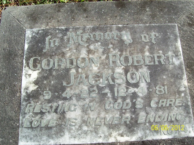 In memory of GORDON ROBERT JACKSON 9.4.22-12.4.81 Rest in God’s Care. Love is never ending Death Cert No. 1981/2599 with no parents listed. |