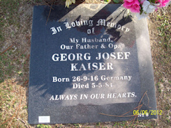 In loving memory of my husband our father & opa GEORG JOSEF KAISER Born 26.9.16 Germany Died 5.5.81 Always in our hearts. Death Cert No. 1981/3221. Parents : Karl Theodore Kaiser and Elizabeth. |