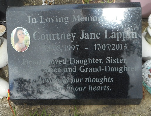 In loving Memory of COURTNEY JANE LAPPIN 15/08/1997-17/07/2013 Dearly loved Daughter, Sister, Grand Niece and Grand-Daughter Always in our thoughts ?? in our Hearts. At first this resting place was Unmarked but with photo of an Adam James Lappin and Courtney Jane Lappin. |