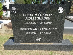 MOLLENHAGEN G C & D.  GORDON CHARLES MOLLENHAGEN 10-7-1922 – 16-4-2010  DOREEN MOLLENHAGEN 28-5-1932 – 27-4-2013