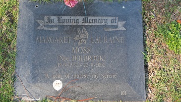 In loving memory MARGARET LAURAINE MOSS (nee HOLBROOK) 19.4.1932 – 22.8.2002 A gem of purest ray serene.