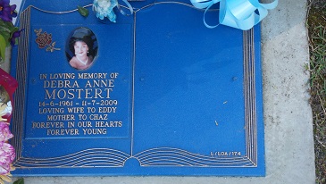 In loving memory of DEBRA ANNE MOSTERT 14-6-1961 – 11-7-2009 loving wife to Eddy Mother to Chaz forever in our hearts forever young.