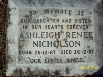 In memory of our daughter and sister in our hearts forever ASHLEIGH RENEE NICHOLSON Born 26.12.87 Died 26.12.87 “Our Little Angel”. Cannot find Death Registered. |