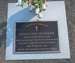 In loving memory of ROSLYN ANN PETTIGREW Born 25-2-1952 Died 22-4-2011 Life’s battles are over for you now, my love You fought them with courage & dignity rest in peace my love Wife of John, Mother of Bernard and Adrian
