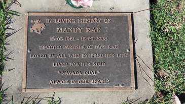 In loving Memory of MANDY RAE 12-5-1961-16-3-2008 Devoted partner of OWY RAE loved by all who entered her life lived for her stud “Navada Dual” always in our hearts. “Bucking Horse” |