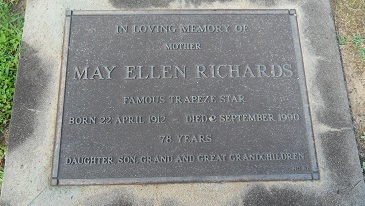 In loving memory of mother MAY ELLEN RICHARDS famous trapeze star Born 22 April 1912 – died 2 Sept 1990. 78 years. Daughter, son, grand and great grand children. |