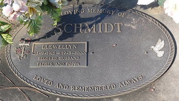 In loving memory of SCHMIDT LLEWELLYN 23.9.1918 – 19.3.2000 Beloved husband father and poppa loved & remembered always. Parents : Ferdinand Daniel Schmidt and Ida Agnes nee Huth. |