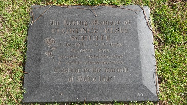In loving memory of FLORENCE ELSIE SCHULTE 1.10.1911-8.4.1994 Beloved Wife, mother grandmother and great grandmother. Resting in the warmth of God’s love. Parents John Alfred Robinson & Ruth nee Weldon |