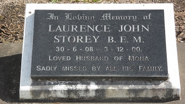 In loving memory of LAURENCE JOHN STOREY B.E.M. 30-6-08 ~ 3.12.00 loved Husband of MONA Sadly missed by all his family. Parents William & Minnie Smith Wife Mona Elizabeth nee Randle |