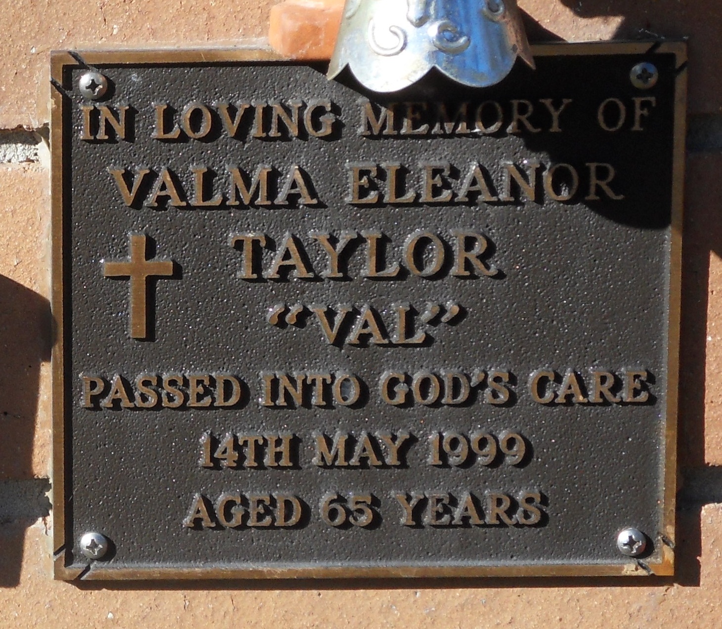 In loving memory of VALMA ELEANOR TAYLOR “Val” Passed into God’s care 14th May 1999. Aged 65 years. |