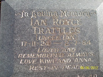In loving memory of IAN ROYCE TRATTLES (Uncle Ian) 17.11.24-2.7.84 Loved and remembered always Love Kiwi and Anna. Rest in Peace. Parents : William and Violet May nee Payne Wife : Dorothy Annetta nee Preston. |