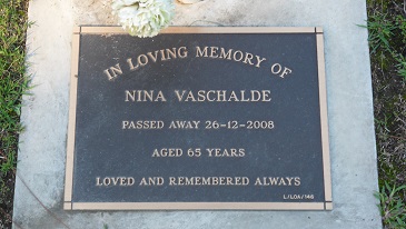 In loving memory of NINA VASCHALDE passed away 16-12-2008 aged 65 years loved and remembered always. |