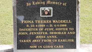 In loving memory of FIONA THERES WADDELL b23.4.1969-D4.4.1986 Daughter of Judy, sister to John, Jennifer, Deborah and Judie Anne; Taken Away from us earlier now in God’s Care. Death Cert No. 1986/2937 Parents : Terrence Schiumerlich and Alice Emma nee Hollingsworth. |