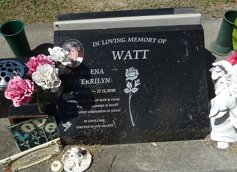 In Loving Memory of WATT RHENA MERRILYN 7-4-1952 – 17.11.2018 Devoted mother of Rick & Craig Nanny of Tia, Summer and Keely. Wife/loved companion of Darren. In God’s Care For ever in our Hearts. |
