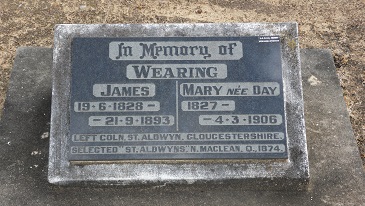 MARY nee DAY 1827-4.3.1906. Death Cert No. 1906/2315 Husband James Wearing Parents William Day & Jane Bunting. |
