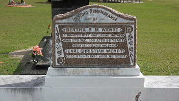 In fond remberance of BERTHA E M WENDT A devoted wife and loving mother Died 27th Dec 1939 Aged 52 years. Birth Cert No. 1878/4031 Death Cert No. 1940/b46667 Parents : August Friedrich Beutel and August Carolina Louisa nee Burow Also her beloved husband CARL CHRISTIAN WENDT Died 12th May 1958 Aged 80 years Just Resting. Carl's Parents Adolph Ludwig Wendt & Emelia Wilhelmine Johanna Schlieman Death Cert No. 1958/b25630. |