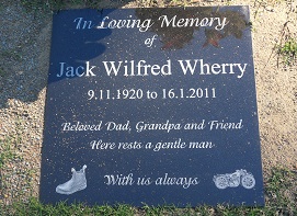 In loving memory of JACK WILFRED WHERRY 9-11-1920 to 16-1-2011 Beloved Dad, Grandpa and Friend Here rests a gentle man. With us always. (Working boot and motor bike) |