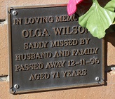 In loving memory of OLGA WILSON Sadly missed by husband and family Passed away 12.11.96 aged 71 years. |