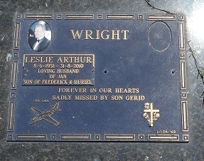 WRIGHT Leslie Arthur 8.6.1951-31.8.2010 Loving Husband of Jan son of Frederick & Muriel Forever in our hearts sadly missed by son Gerid.   ( P2 TAA Plane)