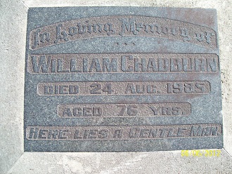 In loving memory of WILLIAM CHADBURN Died 24th August 1985 Aged 76 years Here lies a gentle man. Death Cert No. 1985/6937 Parents : John and Tilley Lavinia nee BRISKIE |