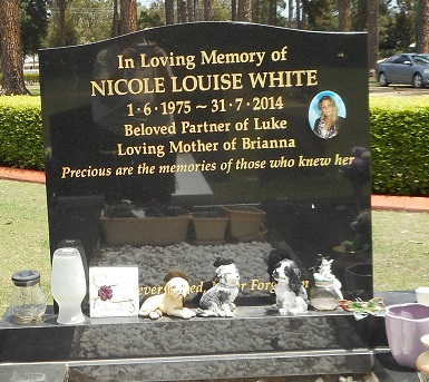 In loving Memory of NICOLE LOUISE WHITE 1.6.1975-31.7.2014. Beloved Partner of Luke Loving Mother of Brianna. Precious are the memories of those who knew her. |