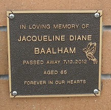 In loving Memory of JACQUELINE DIANE BAALHAM passed away 7.12.2012 Aged 65 forever in our hearts.