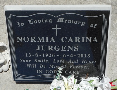 In loving Memory of NORMA CARINA JURGENS 13.8.1926 – 6.4.2018 Your Smile, Love and Heart will be missed forever. In God’s Care. |