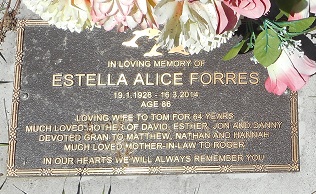 In loving memory of ESTELLA ALICE FORRES 19.1.1928-16.3.2014 aged 86 Loving Wife of Tom for 64 years. Much loved mother of David, Esther, Jon and Danny. Devoted Gran to Matthew, Nathan and Hannah. Much loved Mother-in-to Roger. In our hearts we will always remember you. |