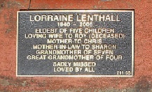 LORRAINE LENTHALL 1940-2006 Eldest of five children Loving wife of You (deceased) Mother to Chris Mother-in-law to Sharon Grandmother of seven Great Grandmother of four Sadly missed Loved by all. |