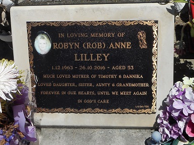 In loving memory of ROBYN (ROB) ANNE LILLEY 1.12.1963 – 23.10.2016 – aged 53 Much loved mother of Timothy & Dannika. Loved Daughter, Sister, Aunty & Grandmother. Forever in our hearts, until we meet again in God’s Care. |