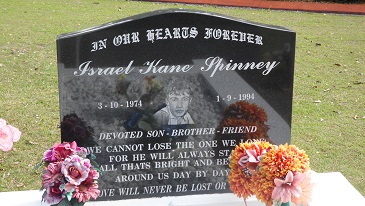 In our hearts forever ISRAEL KANE SPINNEY 3.101974-1.9.1994 Devoted - brother – friend. We cannot lose the one we love for he will always stay in all that’s bright and beautiful around us day by day. His love will never be lost or forgotten. “Bere” A true friend who is loved and respected. Too many precious memories to forget R.I.P. Brother T.H.C. (On the back) ISRAEL. If the sun refused to shine I will still be loving you. When mountains crumble to the sea. There will still be you and me. Your loving sister and soul mate Helen. |